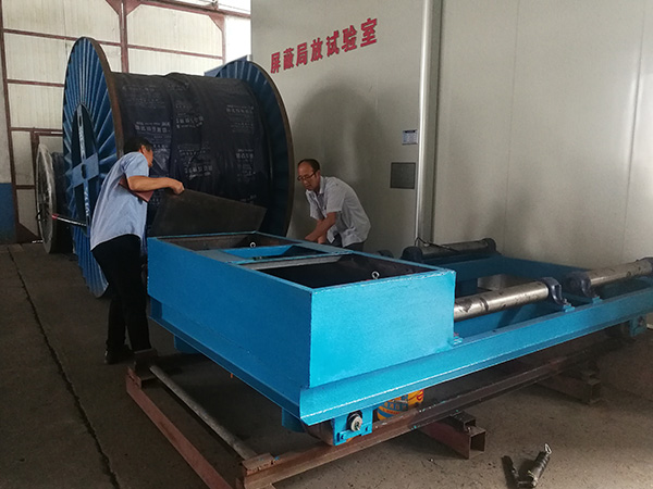 局放屏蔽室是电缆成品局部放电测试专用封闭式场所。过去将电缆运来测试,都是靠人工将整盘笨重的电缆推进推出,费时费力,效率不高,并且存在一定的安全风险。今年8月初,集团生产中心副总监兼设备部长张仲奇提出并负责实施了一个“用有轨电动平板车替代人工搬运”的技改方案。