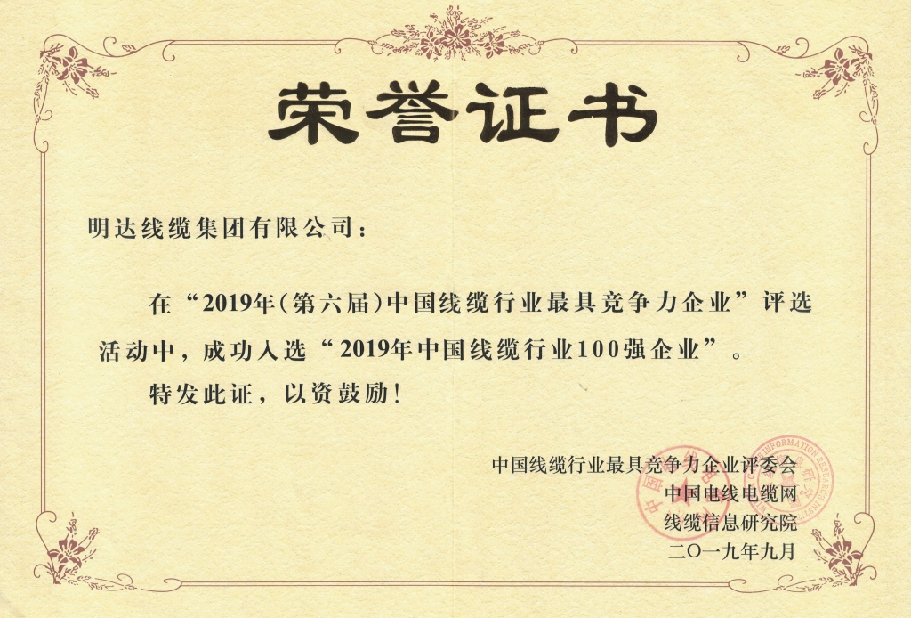 2019年中国电线电缆行业大会由中国电器工业协会电线电缆分会与上海电缆研究所有限公司联合主办。此次评选中国电线电缆行业100强企业,主要根据企业的销售收入、净资产、净利润、出口占比等9项体现企业规模、增长和效率的硬性数据指标进行综合评价得出结果。云顶国际·(中国)唯一官方网站 在这些硬性数据指标的监测中表现突出,成功入围。