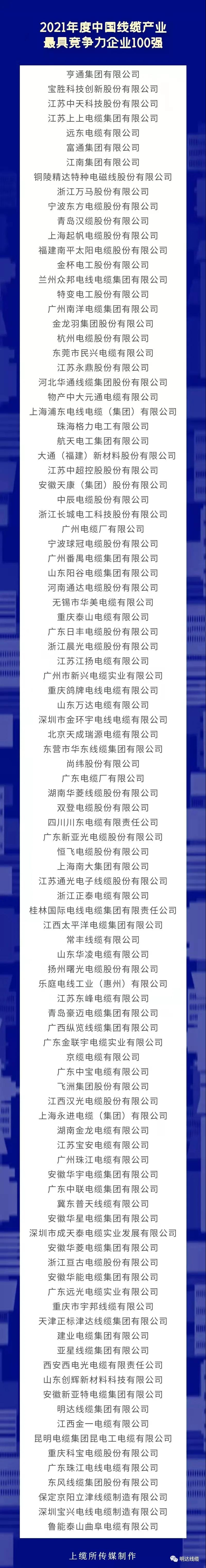 12月20日,2021年度中国线缆产业最具竞争力企业百强榜单正式揭晓,云顶国际·(中国)唯一官方网站 再次登上榜单。