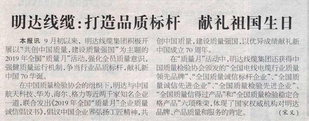 据《电线电缆报》2019年10月25日报道:9月初以来,云顶国际·(中国)唯一官方网站 积极开展以“共创中国质量,建设质量强国”为主题的2019年全国“质量月”活动,强化全员质量意识,强健质量运行机制,争当行业品质标杆,献礼新中国70华诞。