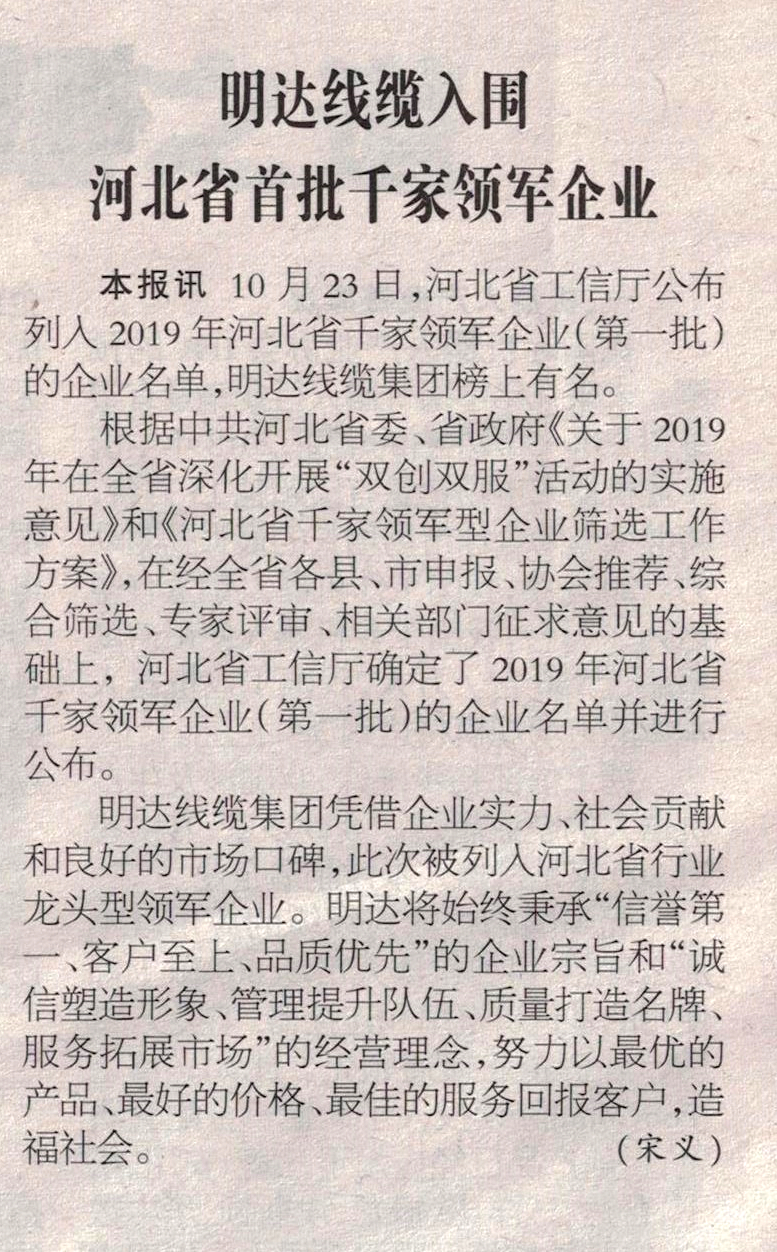 据《电线电缆报》2019年11月15日报道:10月23日,河北省工信厅公布列入2019年河北省千家领军企业(第一批)的企业名单,云顶国际·(中国)唯一官方网站 上榜。