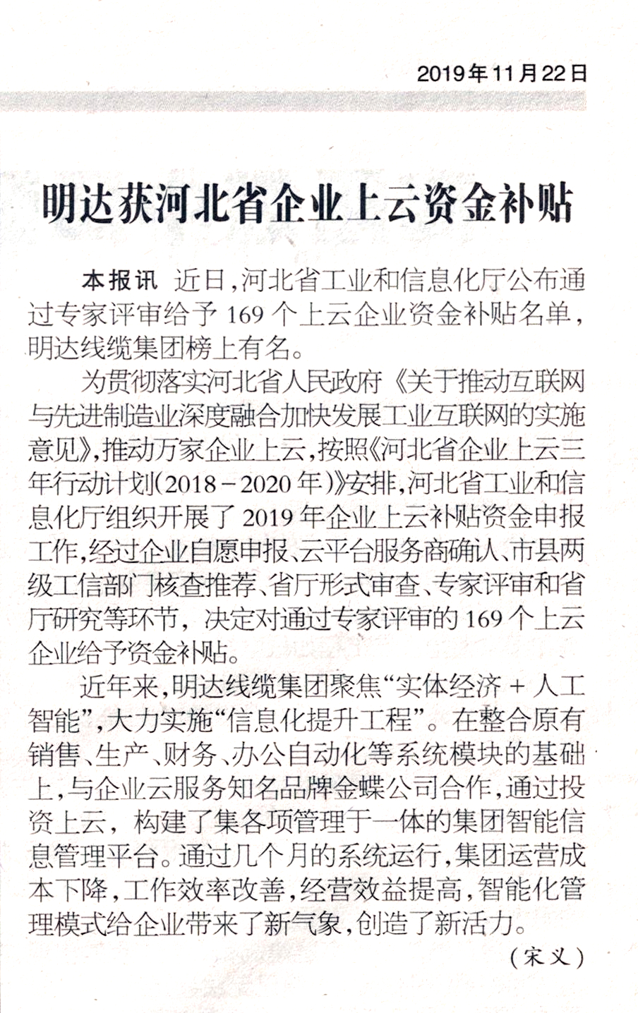 11月22日,《电线电缆报》刊发消息:云顶国际官网获河北省企业上云资金补贴,现予转载: