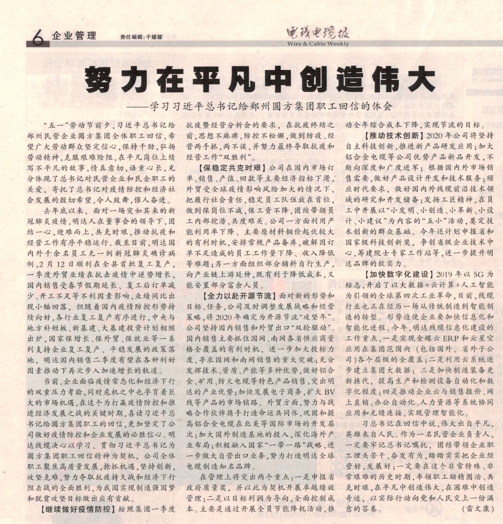 努力在平凡中创造伟大——学习习近平总书记给郑州圆方集团职工回信的体会