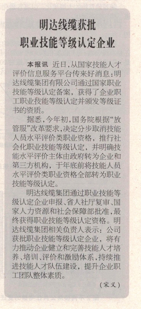 2020年9月25日,《电线电缆报》发表消息《云顶国际官网线缆获批职业技能等级认定企业》,现予转载: