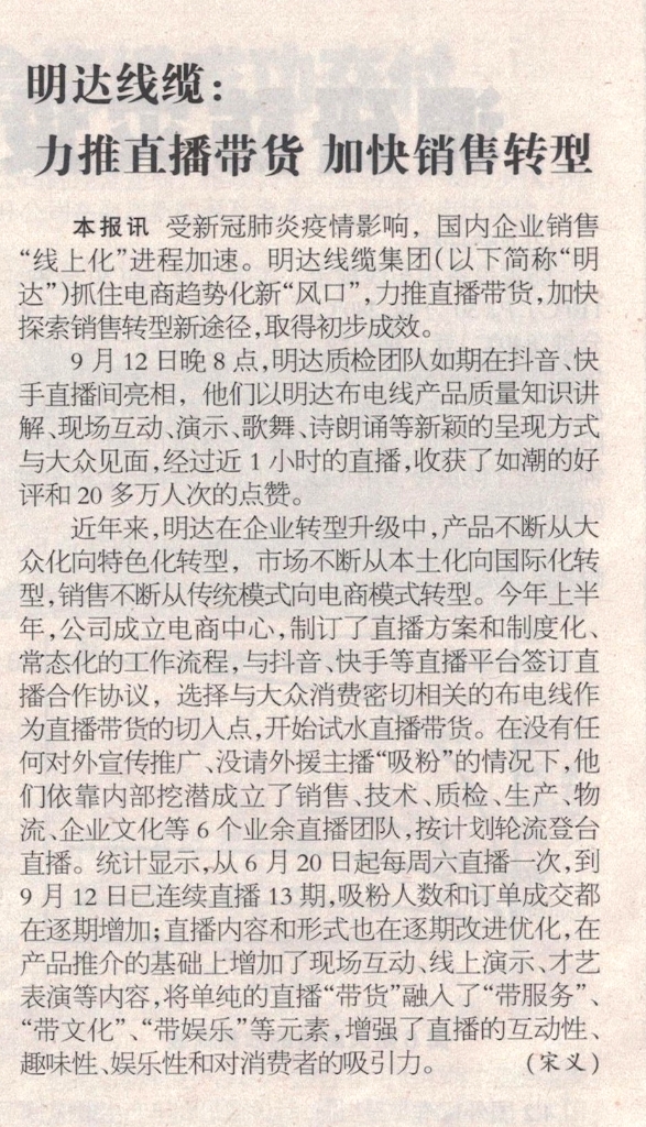 2020年10月2日,《电线电缆报》发表消息《云顶国际官网线缆:力推直播带货 加快销售转型》,现予转载: