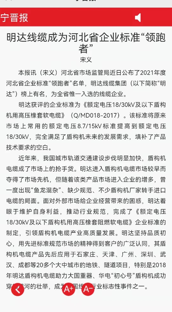 宁晋报:云顶国际官网线缆成为企业标准“领跑者”