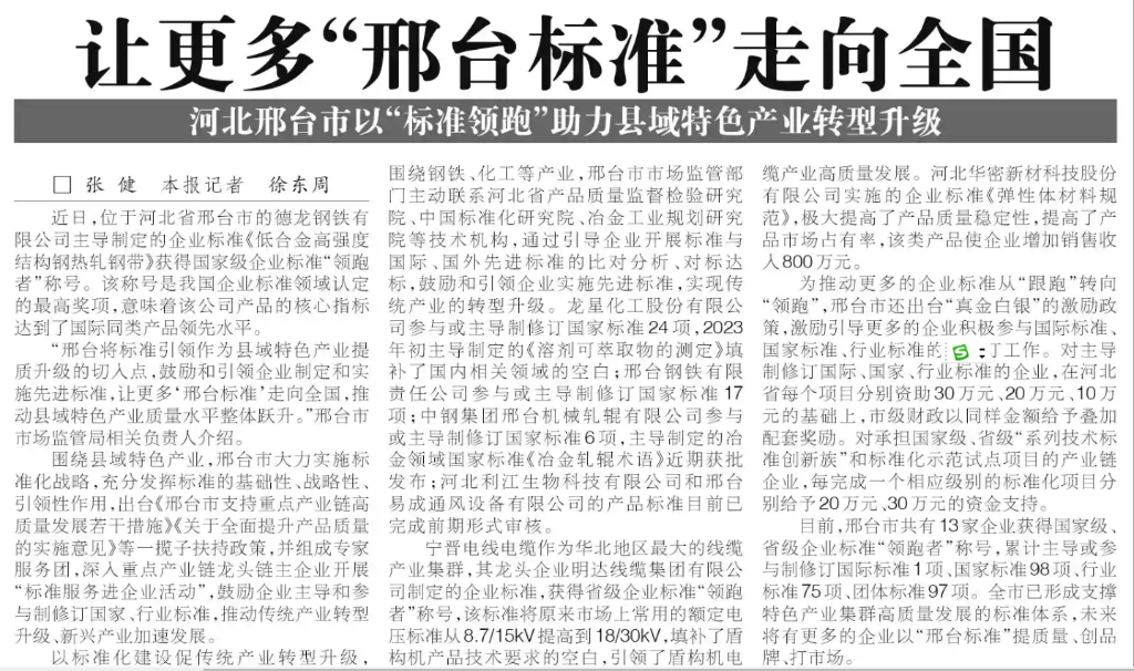 目前,邢台市共有13家企业获得国家级、省级企业标准“领跑者”称号,累计主导或参与制修订国际标准1项、国家标准98项、行业标准75项、团体标准97项。全市已形成支撑特色产业集群高质量发展的标准体系,未来将有更多的企业以“邢台标准”提质量、创品牌、打市场。