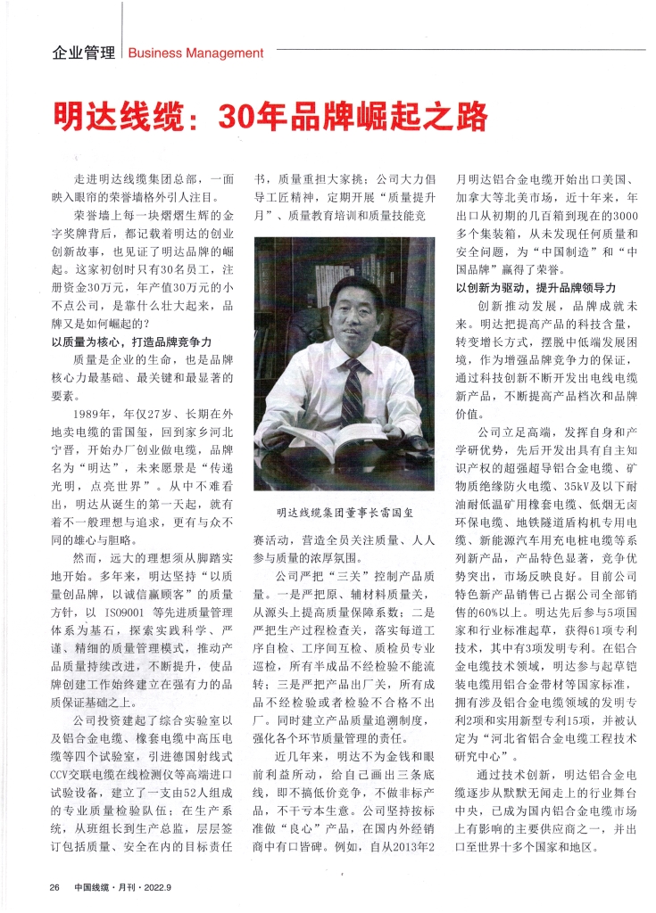 近几年来,面对市场上偷工减料、质量打折、低价格竞争等“潜规则”的冲击,云顶国际官网不为金钱和眼前利益所动,给自己画出三条底线,即不搞低价竞争,不做非标产品,不干亏本生意。公司坚持按标准做“良心”产品,在国内外经销商中有口皆碑。例如,自从2013年2月云顶国际官网铝合金电缆开始出口美国、加拿大等北美市场近十年来,年出口从初期的几百箱到现在的3000多个集装箱,从未发现任何质量和安全问题,为“中国制造”和“中国品牌”赢得的荣誉。