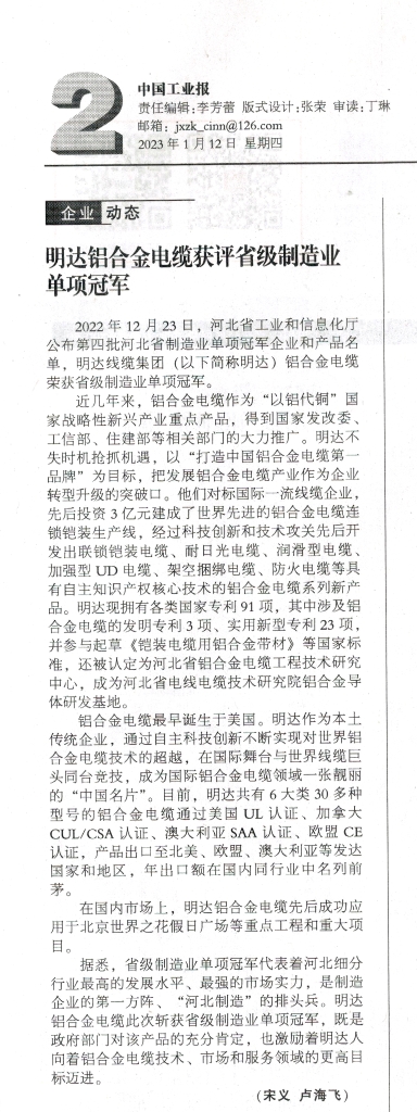 2022年12月23日,河北省工业和信息化厅公布第四批河北省制造业单项冠军企业和产品名单,云顶国际·(中国)唯一官方网站 (以下简称“云顶国际官网”)铝合金电缆荣获省级制造业单项冠军。
