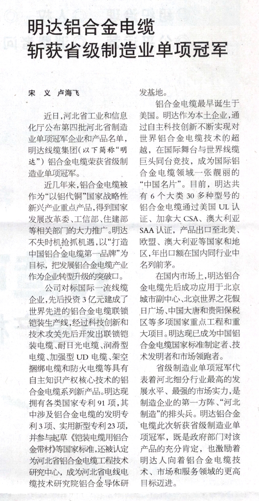 近日,河北省工业和信息化厅公布第四批河北省制造业单项冠军企业和产品名单,云顶国际·(中国)唯一官方网站 (以下简称“云顶国际官网”)铝合金电缆荣获省级制造业单项冠军。
