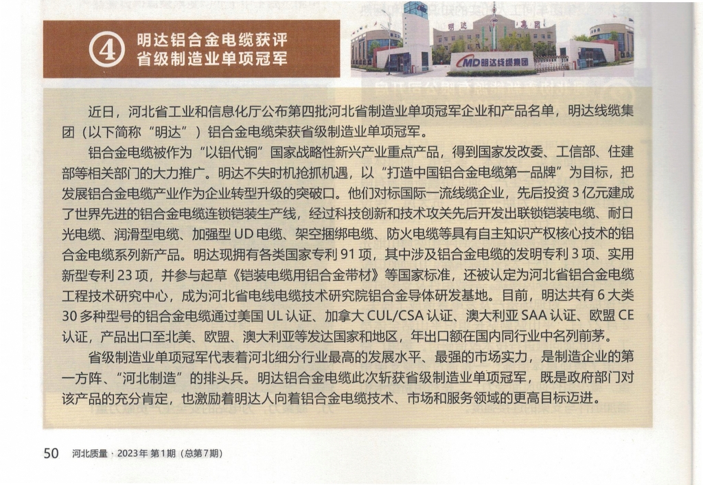 省级制造业单项冠军代表着河北细分行业最高的发展水平、最强的市场实力,是制造企业的第一方阵、“河北制造”的排头兵。云顶国际官网铝合金电缆此次斩获省级制造业单项冠军,既是政府部门对该产品的充分肯定,也激励着云顶国际官网人向着铝合金电缆技术、市场和服务领域的更高目标迈进。