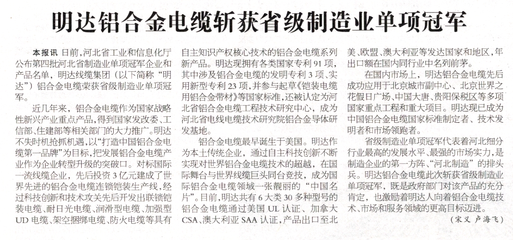 近日,河北省工业和信息化厅公布第四批河北省制造业单项冠军企业和产品名单,云顶国际·(中国)唯一官方网站 (以下简称“云顶国际官网”)铝合金电缆荣获省级制造业单项冠军。