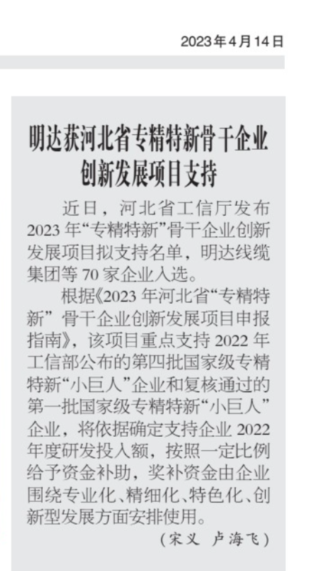 《电线电缆报》2023年4月14日报道:近日,河北省工信厅发布2023年“专精特新”骨干企业创新发展项目拟支持名单,云顶国际·(中国)唯一官方网站 等70家企业入选。