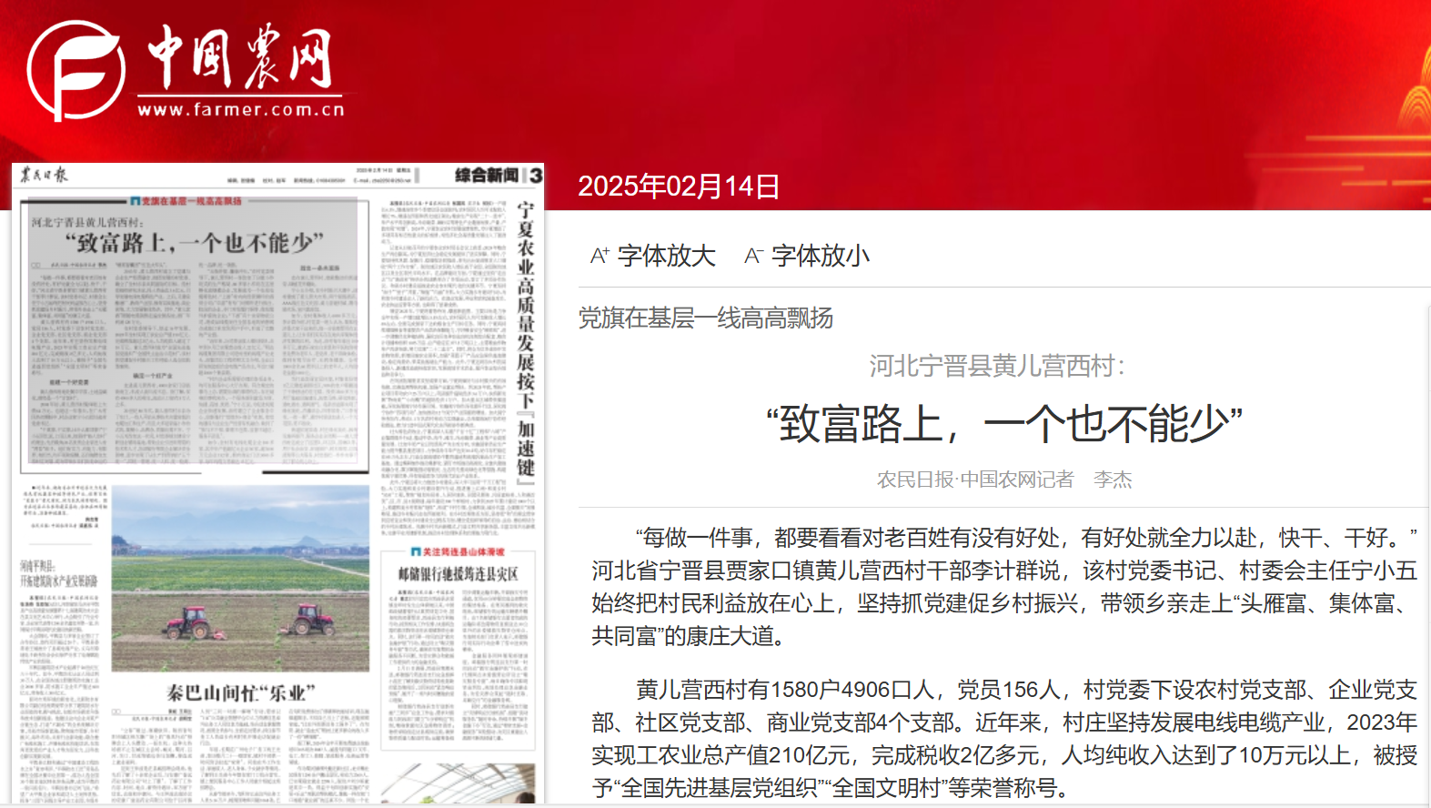 2025年2月14日出版的《农民日报》发表通讯《河北宁晋县黄儿营西村:“致富路上,一个也不能少”》。全文发下: